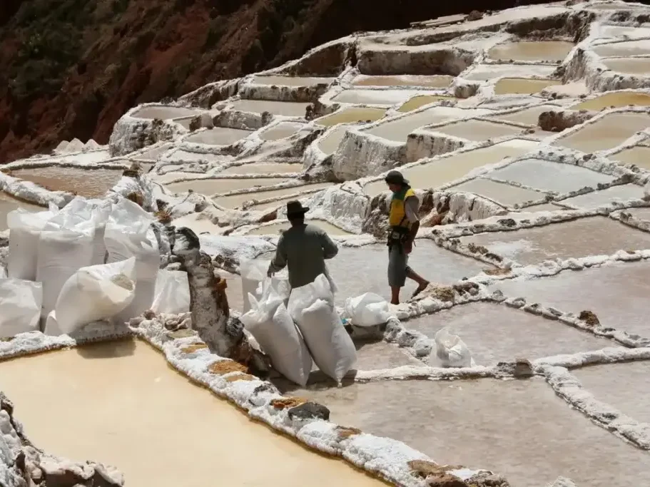 Next are the stunning Maras salt mines. From afar, they appear as a mosaic of white carved into the mountainside. With over 3,000 active salt pools, this site has been used by local families since pre-Incan times.